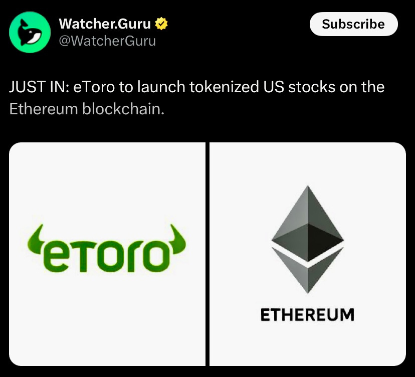 eToro is launching tokenized U.S. stocks and ETFs on Ethereum, with CME Group to offer tokenized futures