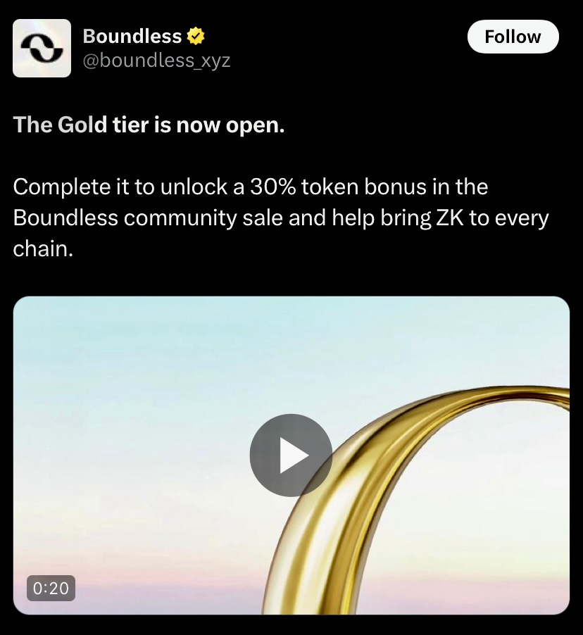 Boundless launched Gold tier with a 30% token bonus in its community sale to reward early supporters and boost zk cross chain growth