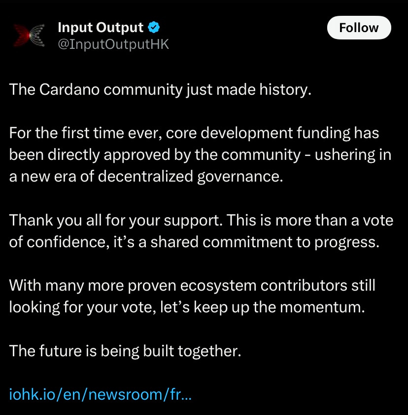 Cardano approved $70M for IOE to advance core upgrades like Ouroboros Leios, Hydra, and Mithril, enhancing throughput, scaling, and lightweight verification