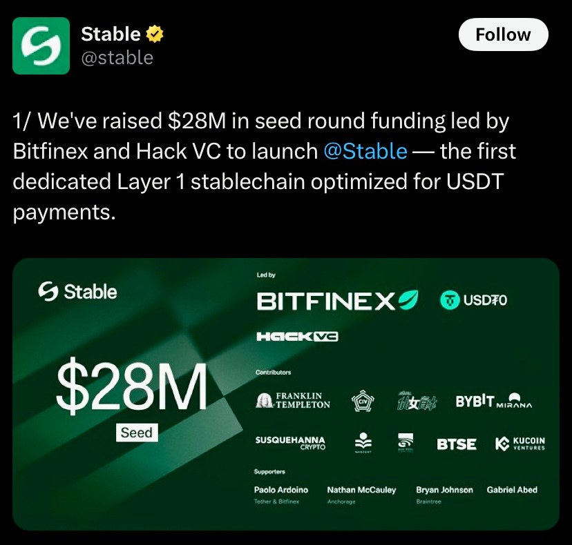 Stable raised $28M to build a USDT-focused Layer 1 chain, backed by Bitfinex, Hack VC, and Franklin Templeton
