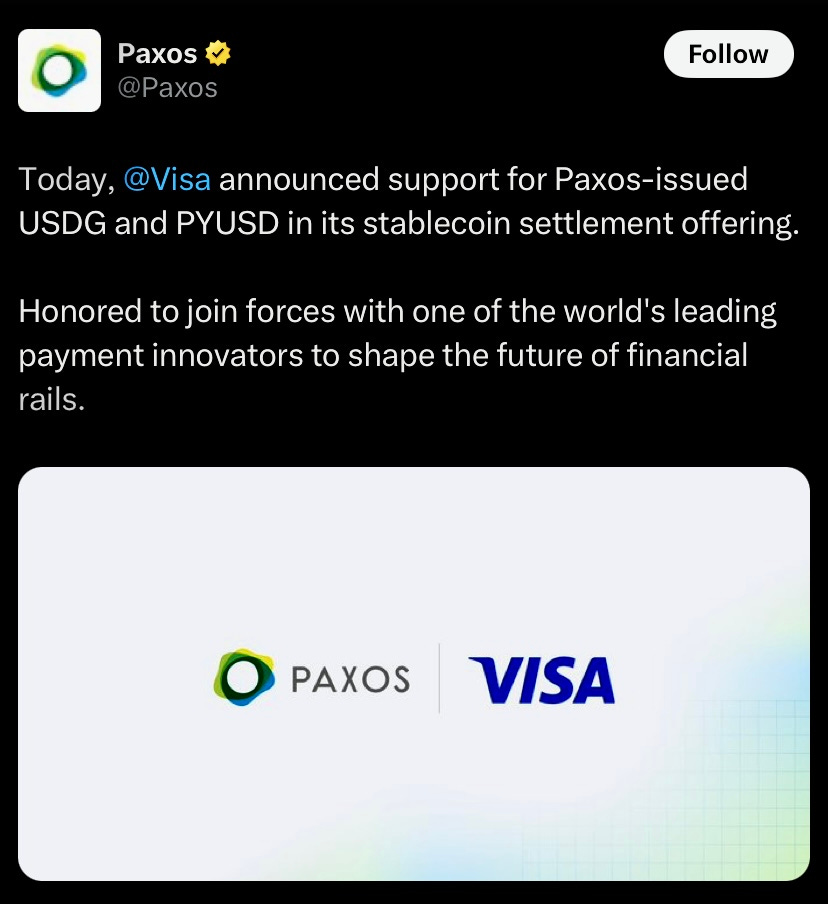 Visa announce support for PYUSD, USDG, and EURC across Ethereum, Solana, Stellar, and Avalanche