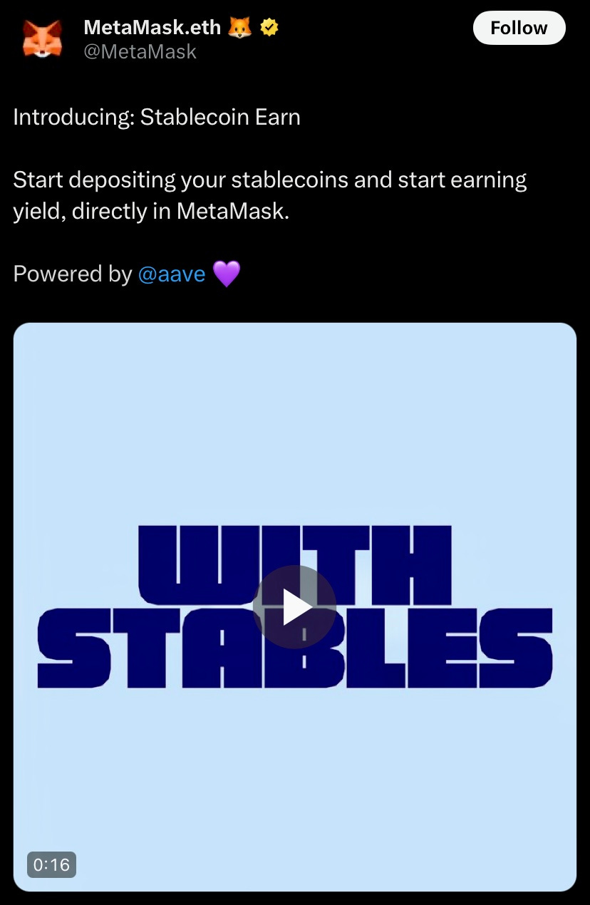 MêtaMăsk integrated Aave for Stablecoin Earn, now lets users earn stablecoin yield through Aave directly in the wallet.