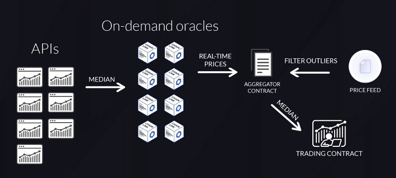 An order gets executed in the trading platform -> the trading contract requests the current price from the aggregator contract —> the aggregator contract then fetches the current price from 8 Chainlink nodes —> each of the 8 nodes takes the median price from 7 exchange APIs and sends the result to the aggregator contract — > the aggregator contract then takes the median a second time to make sure there isn’t any outliers, making each step decentralized and no single point of failure — > it then sends the median to the trading contract to execute the order.