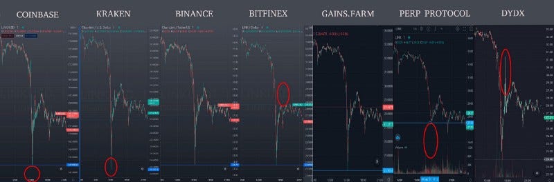 As seen above during the market crash of last year, using Link/USD charts across different exchanges, gTrade tracked the median price across 8 exchanges with 100% uptime. Traders in gTrade never experienced these wicks. As you can see in the image above, top centralized exchanges experienced this, even decentralized exchanges like DYDX.