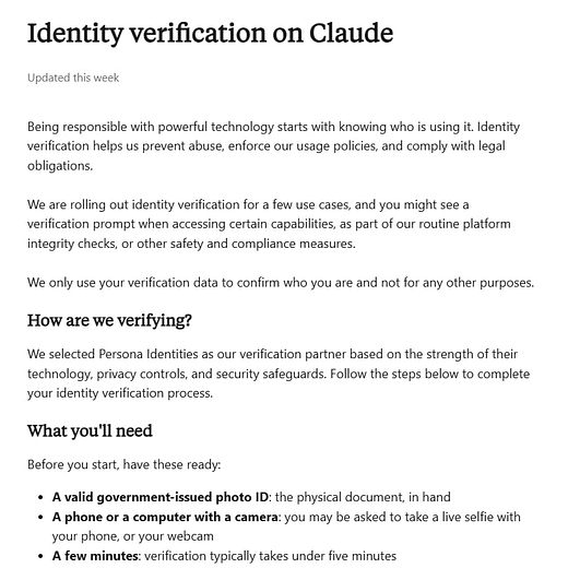 Anthropic now requires government ID and photo verification for new Claude users despite no regulatory mandate