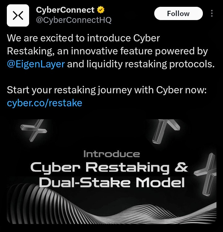 Cyberconnect has joined restaking scene with Cyber restaking deposits allowed are- @RenzoProtocol @puffer_finance @ether_fi