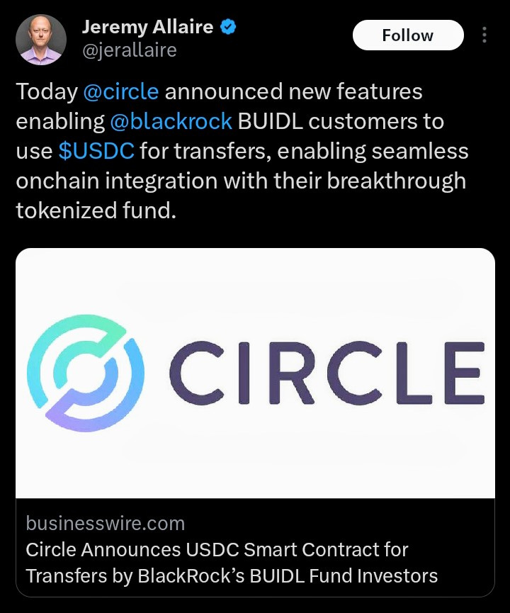 Circle launched USDC smart contract support specifically tailored for BlackRock BUIDL investors.