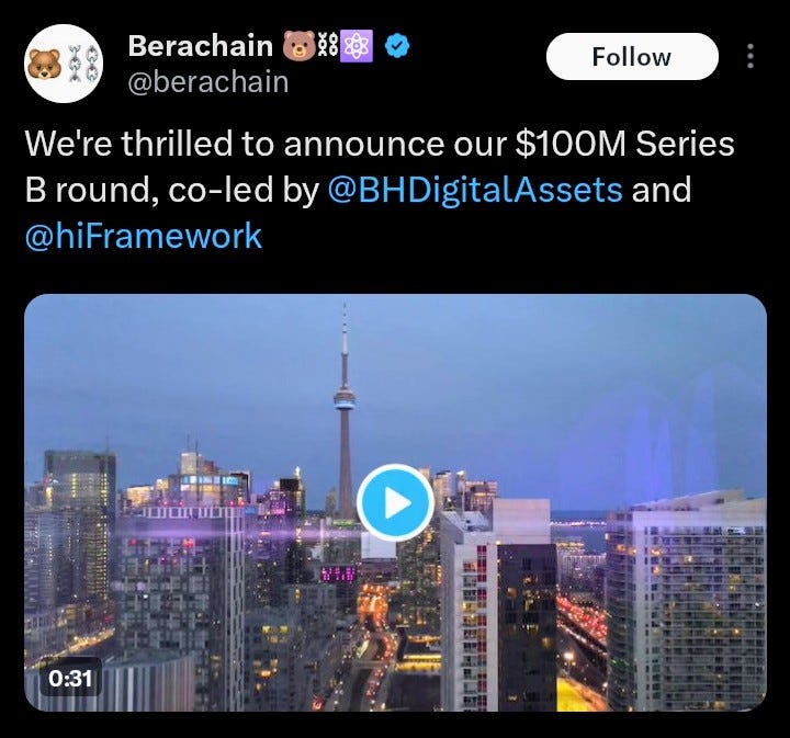 Berachain announce $100M series B raise. Led by @hiFramework and @BHDigitalAssets