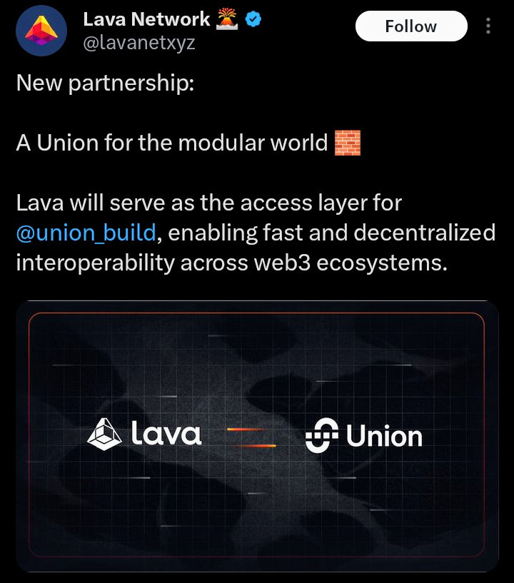 Union is collaborating with Lava Network to enhance data access speed, reliability, and security for Union users. This includes a $100k public RPC program to integrate node operators with Union via Lava Network, offering rewards in Union tokens