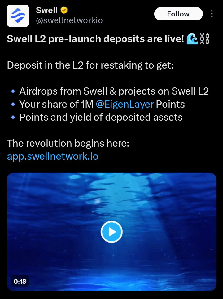 ALT , STONE, PT-rswETH and mswETH, mstETH, mwbETH, mmETH from @Eigenpiexyz_io are among the assets accepted on Swell for its L2 pre-launch deposits for Swell airdrop
