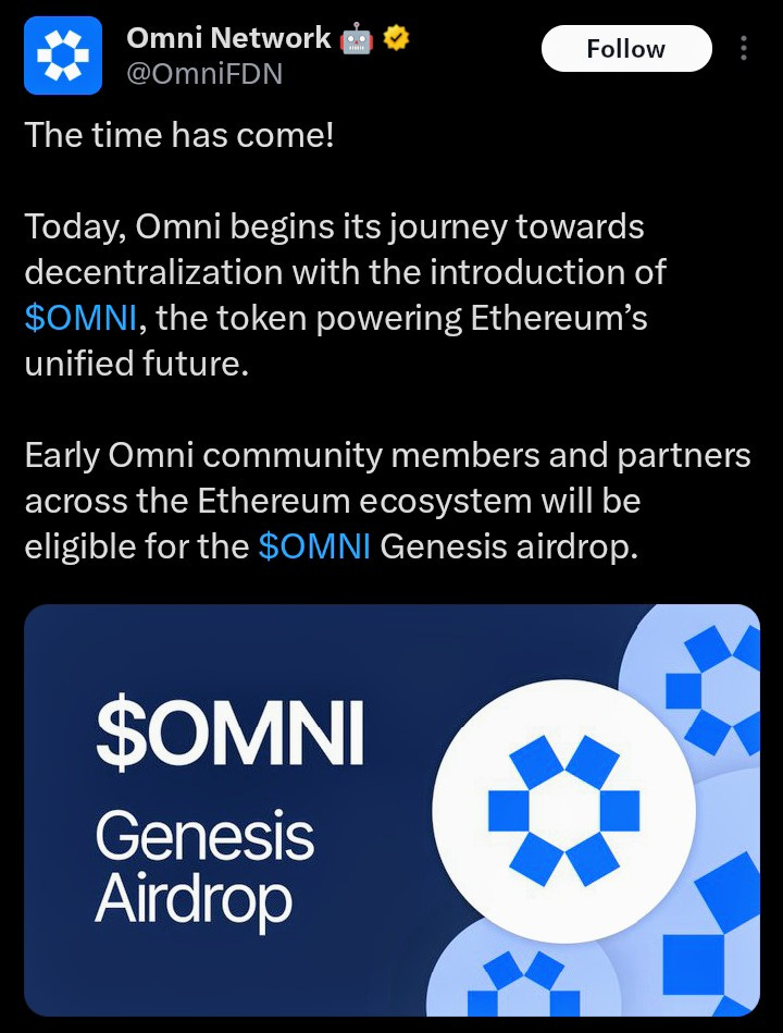 $OMNI to airdrop 13.3% to Eigen restakers, 10% to beacon chain solo stakers, 7.7% going to Miladys, 5% to redacted remilio babies, 5.7% to Pudgy Penguins and 2.5% to Injective ninjas