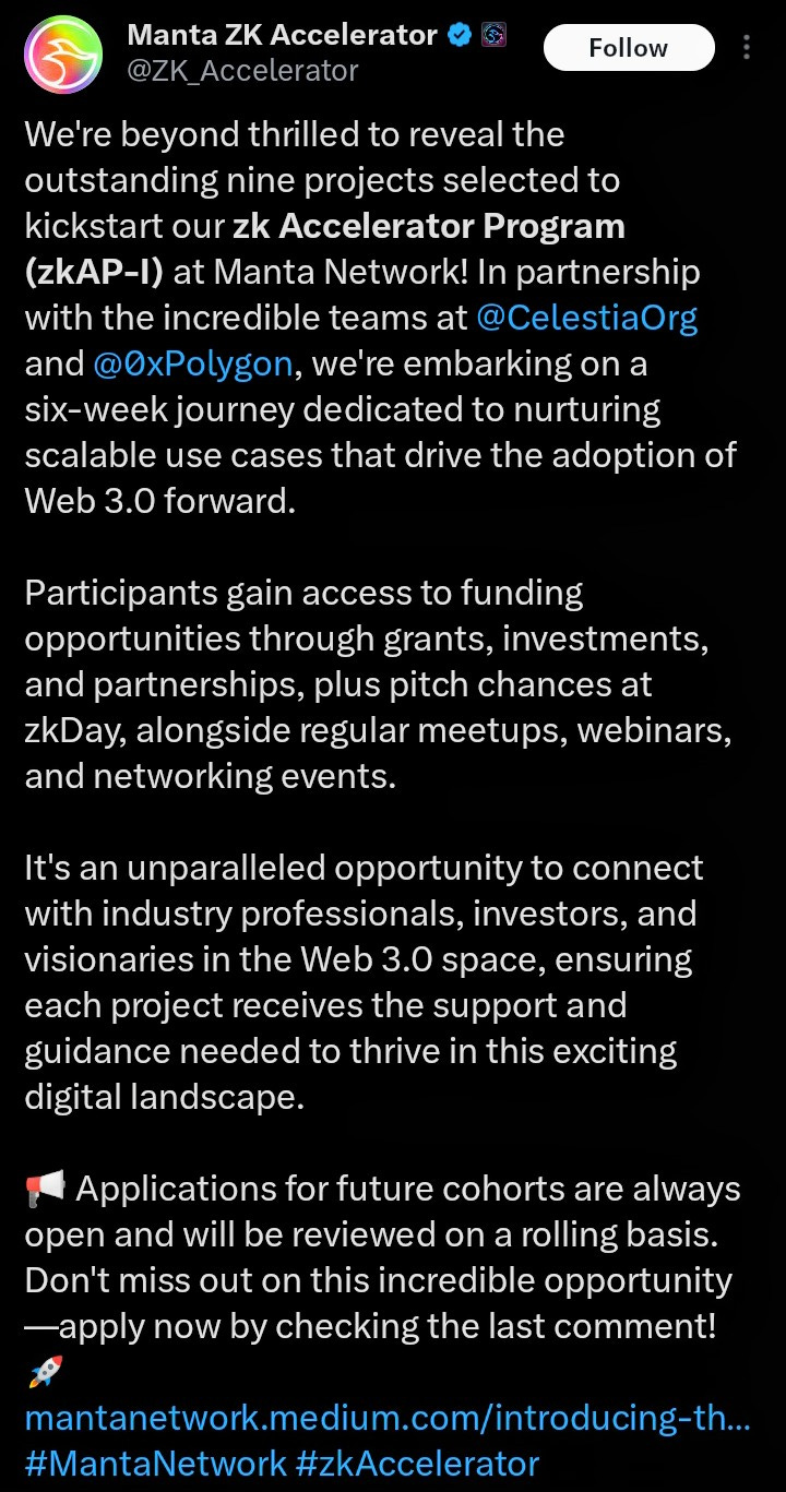 Manta Network announce selection of nine projects for their Manta zk Accelerator Program in collaboration with CelestiaOrg and 0xPolygon. Study projects who qualified