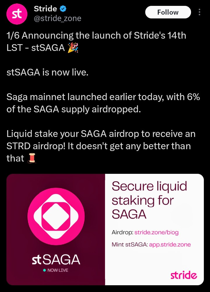 Stride launches stSAGA. Stake your SAGA for stride airdrop