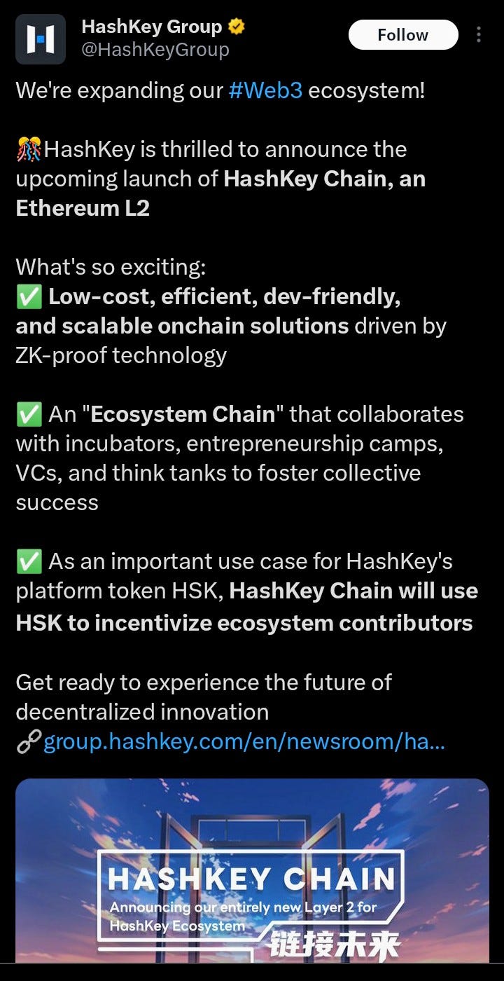 HashKey Capital announce upcoming launch of ETH zk-L2 chain. Will use $HSK to incentivize chain contributors