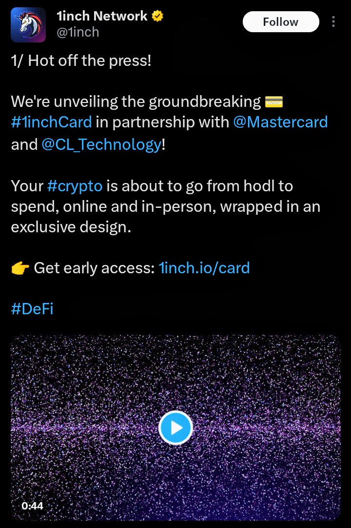 1inch has launched a Web3 debit card in collaboration with Mastercard and Baanx.