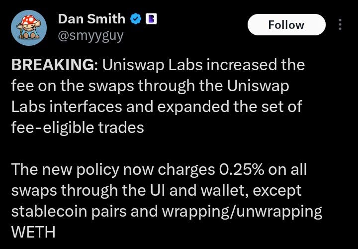 Uniswap fee increase. Time for other dexes to vampire attack. Already seeing Aerodrome shills, seems promising