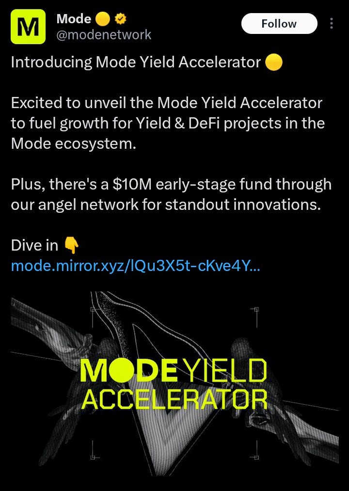 Mode announce The Mode Yield Accelerator Program which aims to stimulate growth in the Yield & DeFi sectors within the Mode ecosystem, offering a $10M fund for early-stage projects. Running until end of June 2024