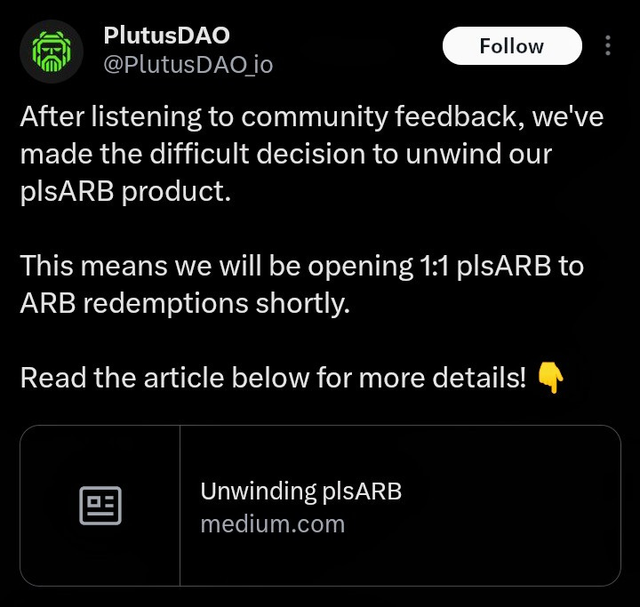 PlutusDAO discontinued plsArb product following community input with plans to initiate 1:1 plsARB to ARB redemptions soon.
