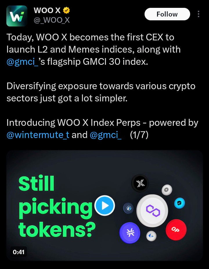 Woo X has launched meme coin L2 index perpetuals in collaboration with Wintermute and GMCI