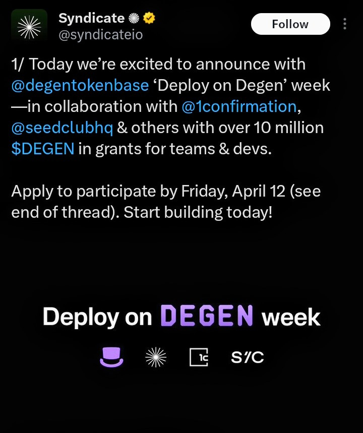 Degen chain to grant 10M $Degen for teams in “Deploy on Degen” week