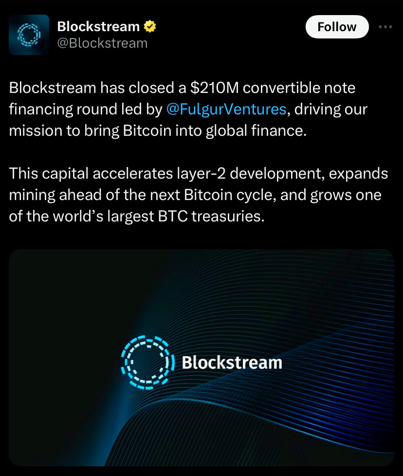 Blockstream secures $210M to drive L2 growth and expand its bitcoin treasury.