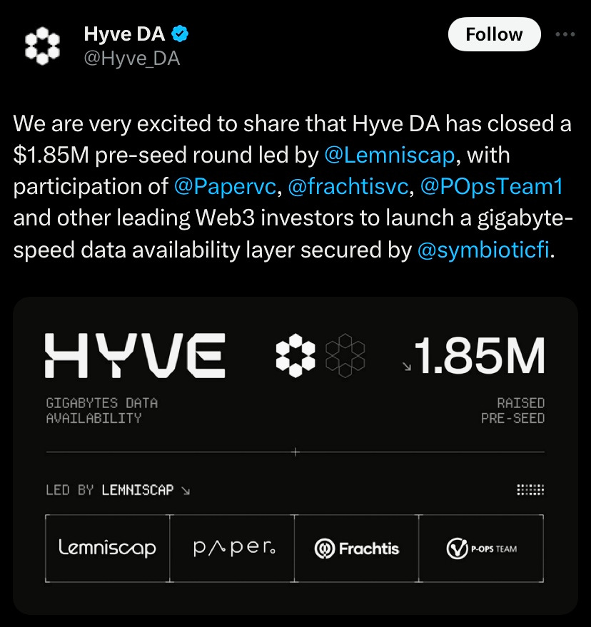 DA layer secured by Symbiotic — Hyve, closes $1.85M pre-seed round, led by Lemniscap