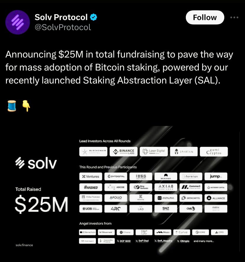 Solv raised $11M at $200M val from Nomura, Blockchain Capital and OKX Ventures to power BTC restaking with recently launched SAL (Staking Abstraction Layer)