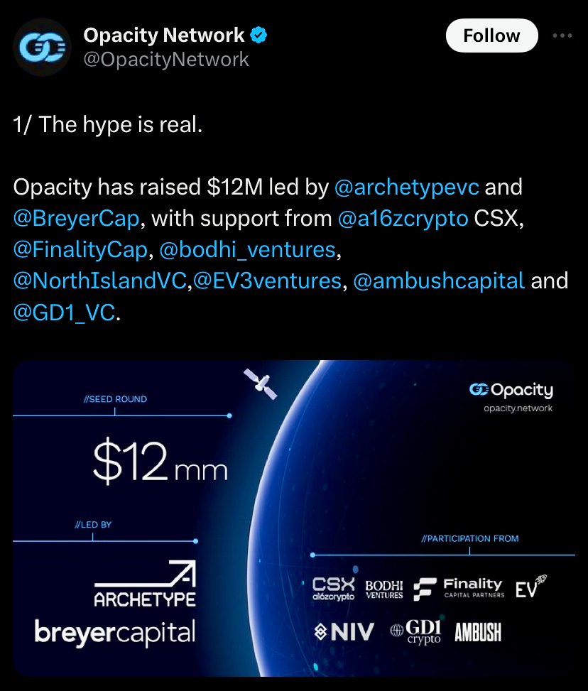Opacity aiming to launch verified data network powered by zkTLS, MPC architecture and economic security from EigenLayer, allows users to verify and privately share data from anywhere on the internet raises $12M seed round led by Archetype and Breyer Capital