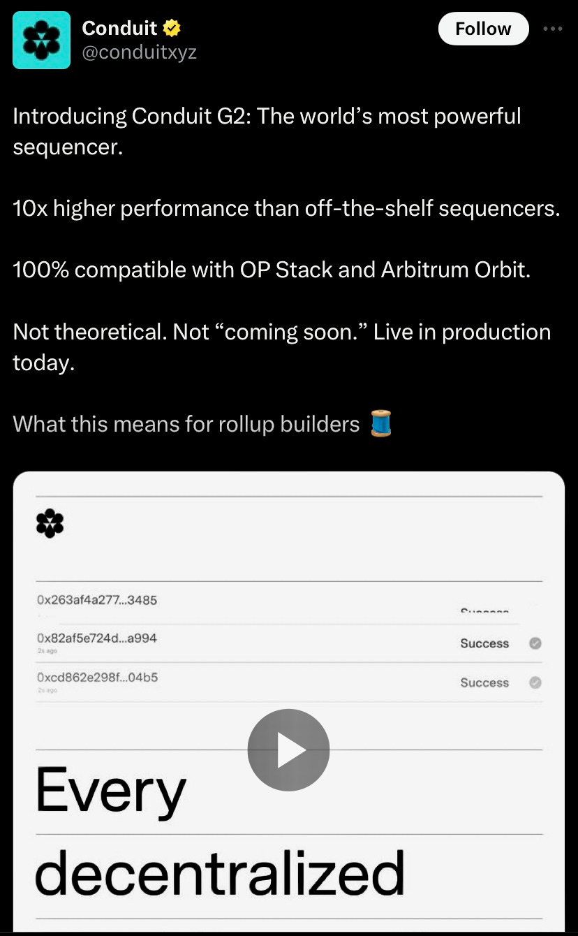 Conduit unveiled G2, a sequencer 10x faster than tyr market average. Capable of 50-100 Mgas/s, it aims to increase the throughout of complex dapps