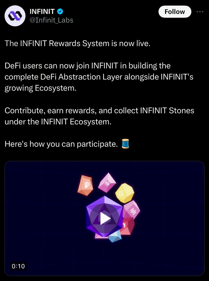 Defi abstraction layer, Infinit labs rewards System is now live. Login into Infinit and earn stones