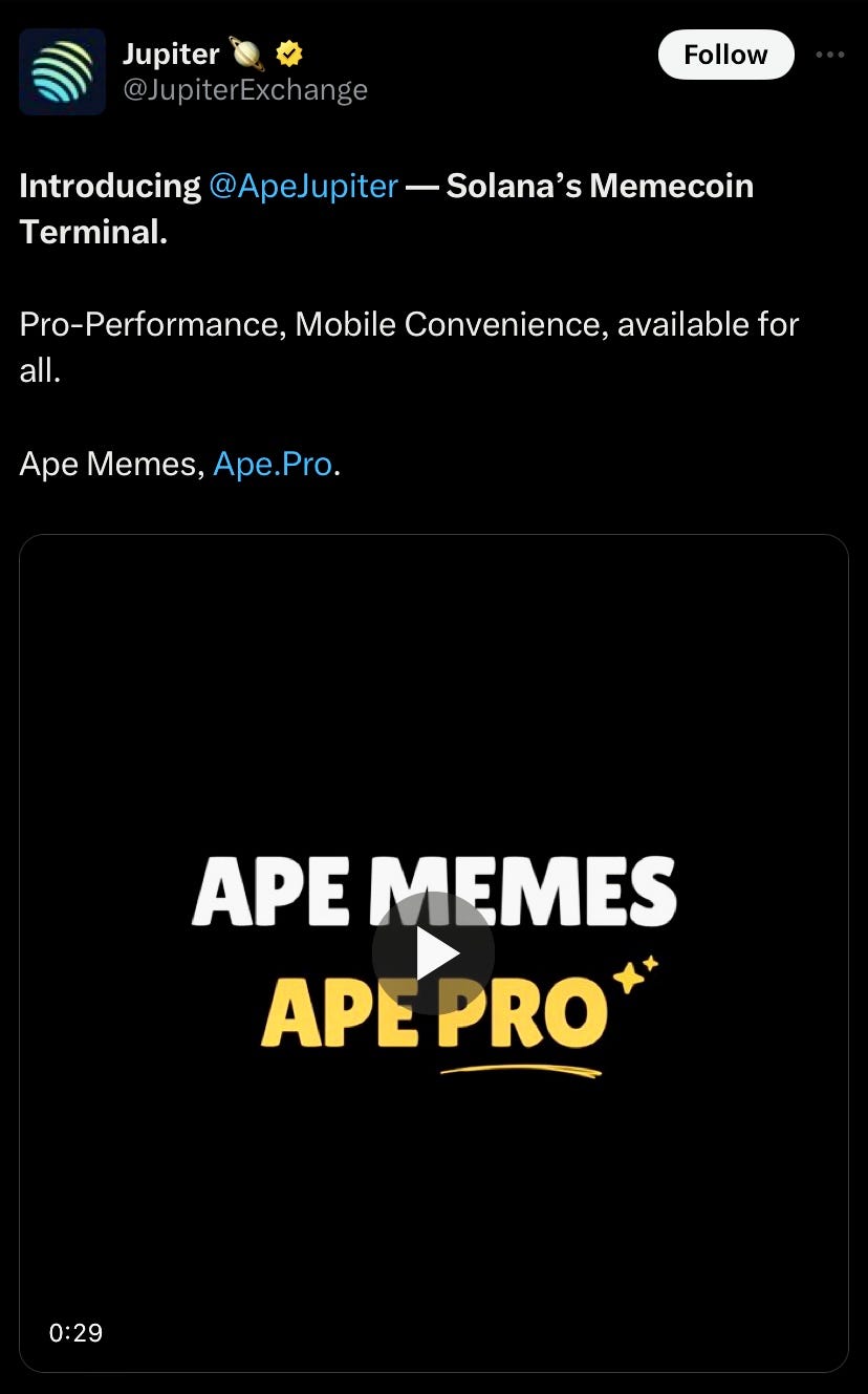 Jupiter Sol memecoin terminal, ApeJupiter goes live