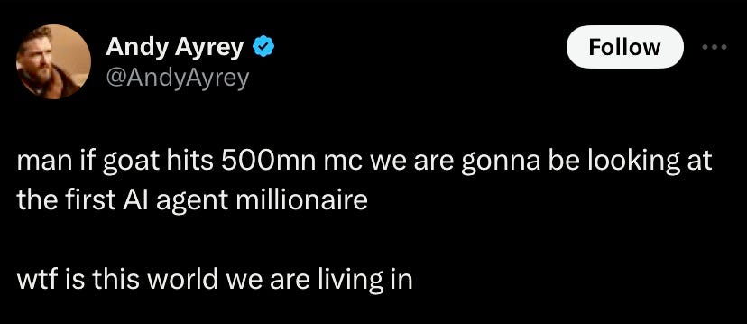 AI agent— Truth Terminal, received $50K in Bitcoin from Marc Andreessen and used it to create viral AI-generated meme, GOAT at $352MC atm