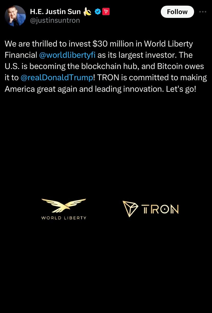 Justin Sun invests $30M into Donald Trump World Liberty Finance