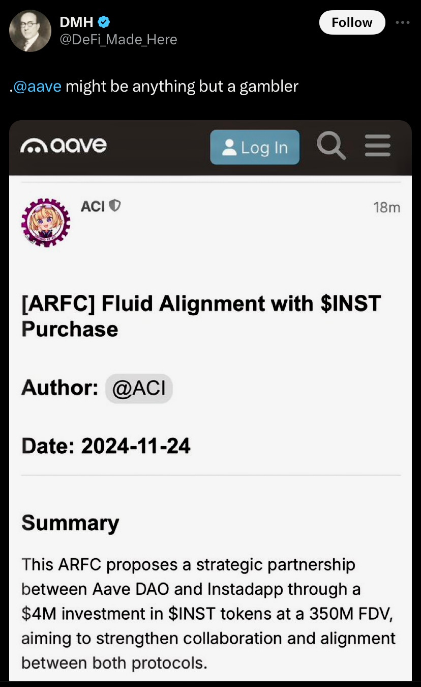 Aave DAO propose to buy 1.1% ($4M) of Instadapp token INST and use 1/3 for liquidity incentives
