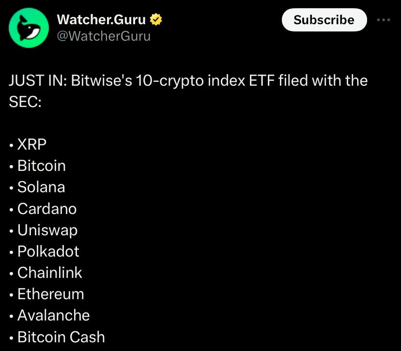 SEC files Bitwise 10 Crypto Index ETF- BTC, ETH, SOL, XRP, Cardano, Avalanche, Chainlink, Bitcoin Cash, Uniswap, Polkadot