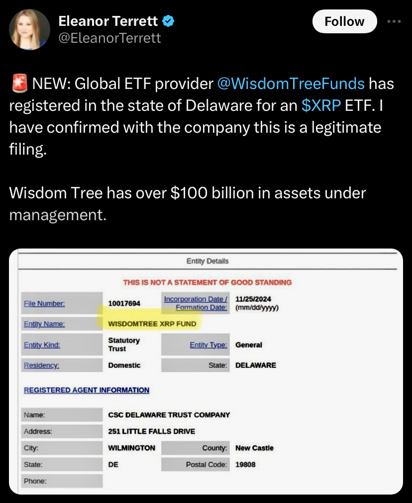 WisdomTreeFunds has registered in the state of Delaware for an XRP ETF