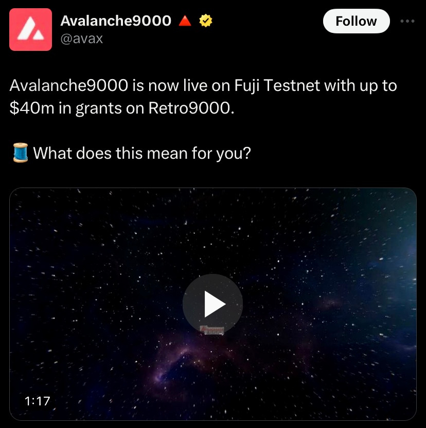 Avalanche9000 has officially launched on Fuji Testnet, devs can now launch L1 easily on Avax, fees on C-Chain are reduced by 96%, offering up to $40 million in retroactive grants, including $2 million for referral programs, etc
