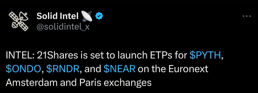 21Shares to launch ETPs for PYTH, ONDO, RNDR, NEAR on the Euronext Amsterdam and Paris exchanges
