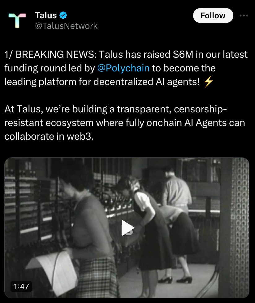 Polychain led $6m round into Talus at $150m val, building MOVE based decentralized ai agents that run fully onchain