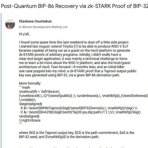 Lightning Labs CTO Olaoluwa Osuntokun posted a working zk-STARK prototype to the Bitcoin dev mailing list that lets wallet owners prove key ownership without exposing their seed, designed to rescue funds if Bitcoin ever disables Taproot key-path spending as a quantum defense