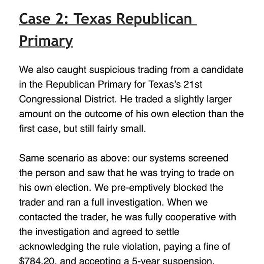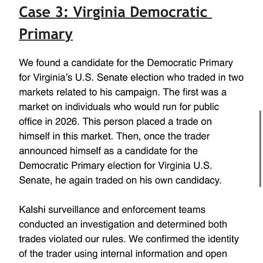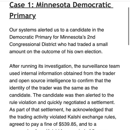 Kalshi just put out a press release saying they caught three instances of candidates for public office betting on / against themselve in Minnesota, Texas and Virginia