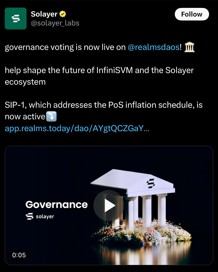 Solayer has launched SIP‑1, its first governance proposal, to set LAYER token PoS inflation at 8% annually with a 15% yearly reduction