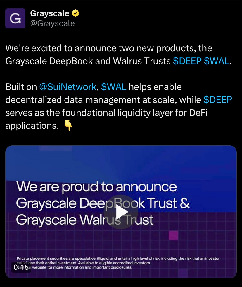 Grayscale launched DeepBook and Walrus Trusts, giving accredited institutional investors access to Sui’s DEEP and WAL tokens