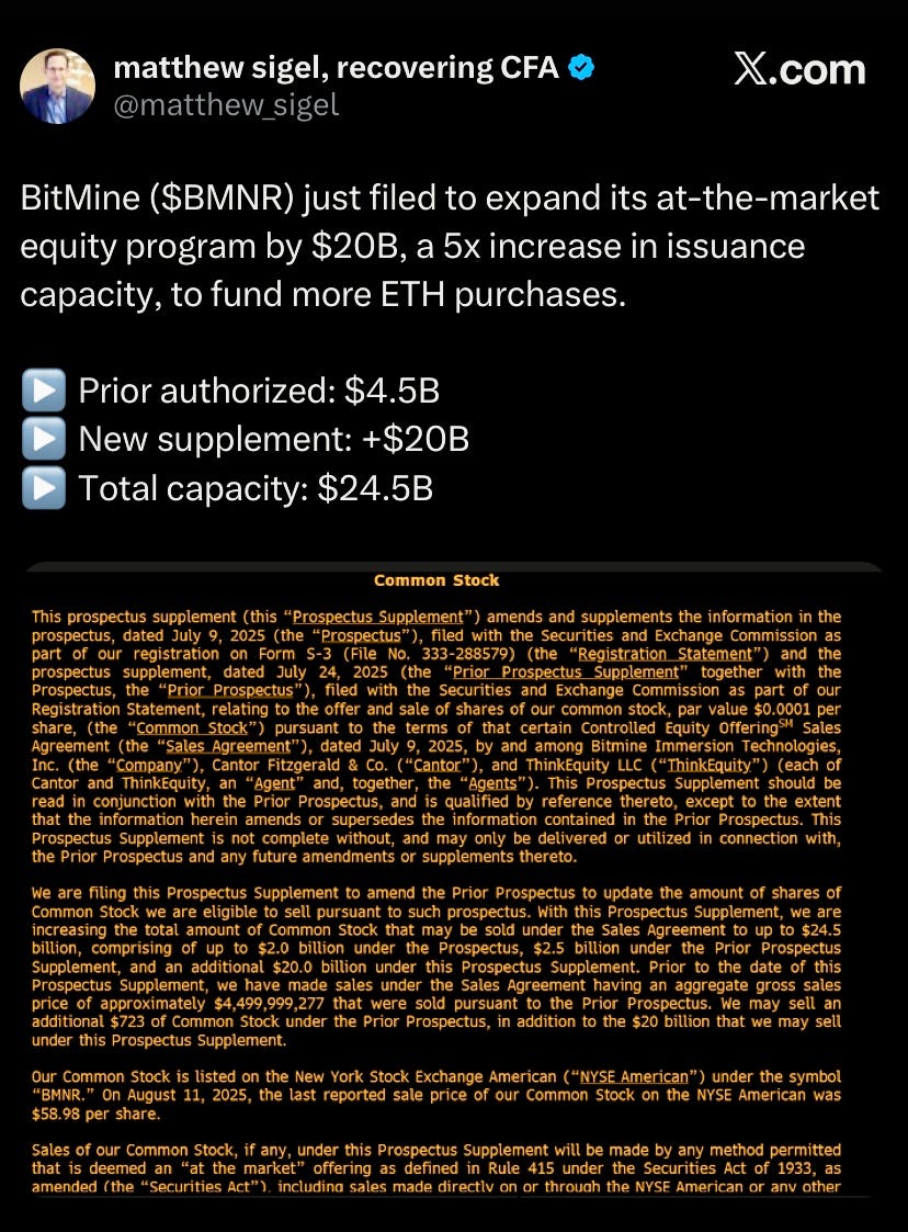 Bitmine filed to expand their at the market offering program so they can sell up to $24.5 billion worth of stock to fund more Ethereum purchases