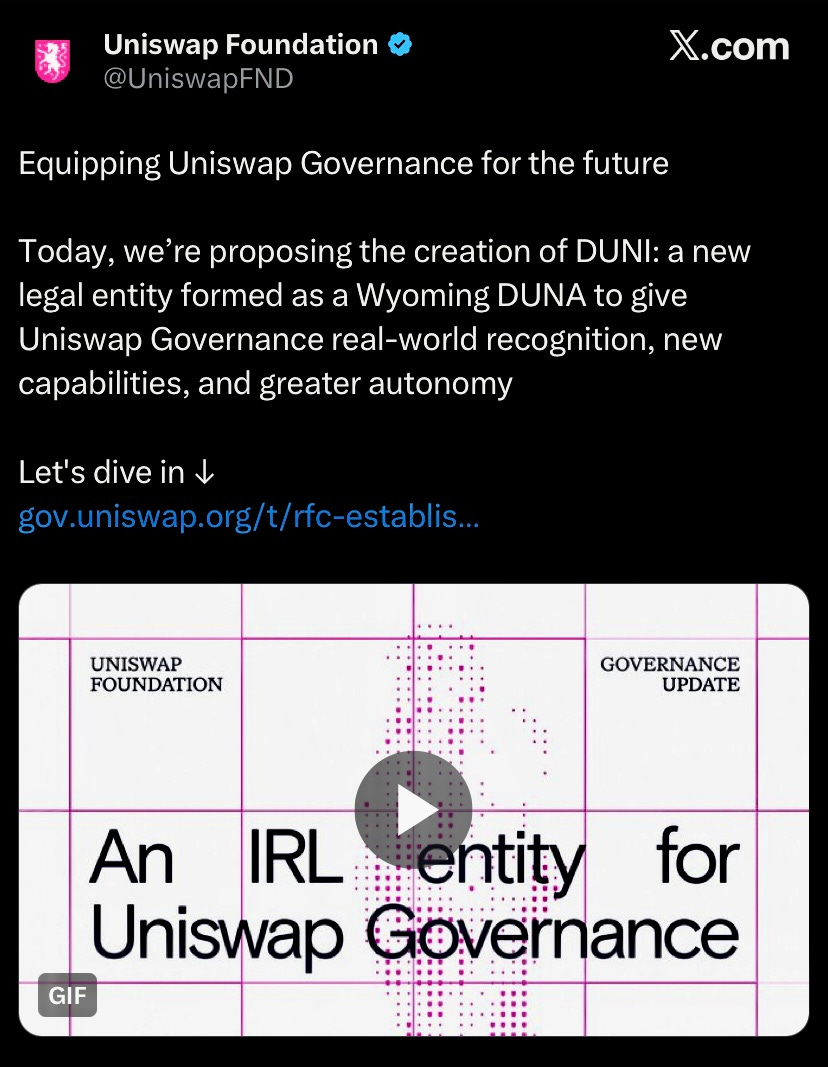 Uniswap Foundation proposed forming a legal entity for their DAO under Wyoming’s “DUNA” legal framework for DAOs, seeking $16.5M in UNI for taxes and legal costs, paving the way to activate protocol fees.