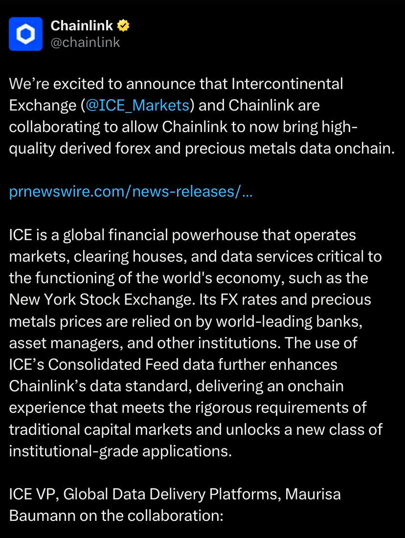 Chainlink partnered with ICE Markets, parent company of NYSE to bring forex, precious metals data onchain