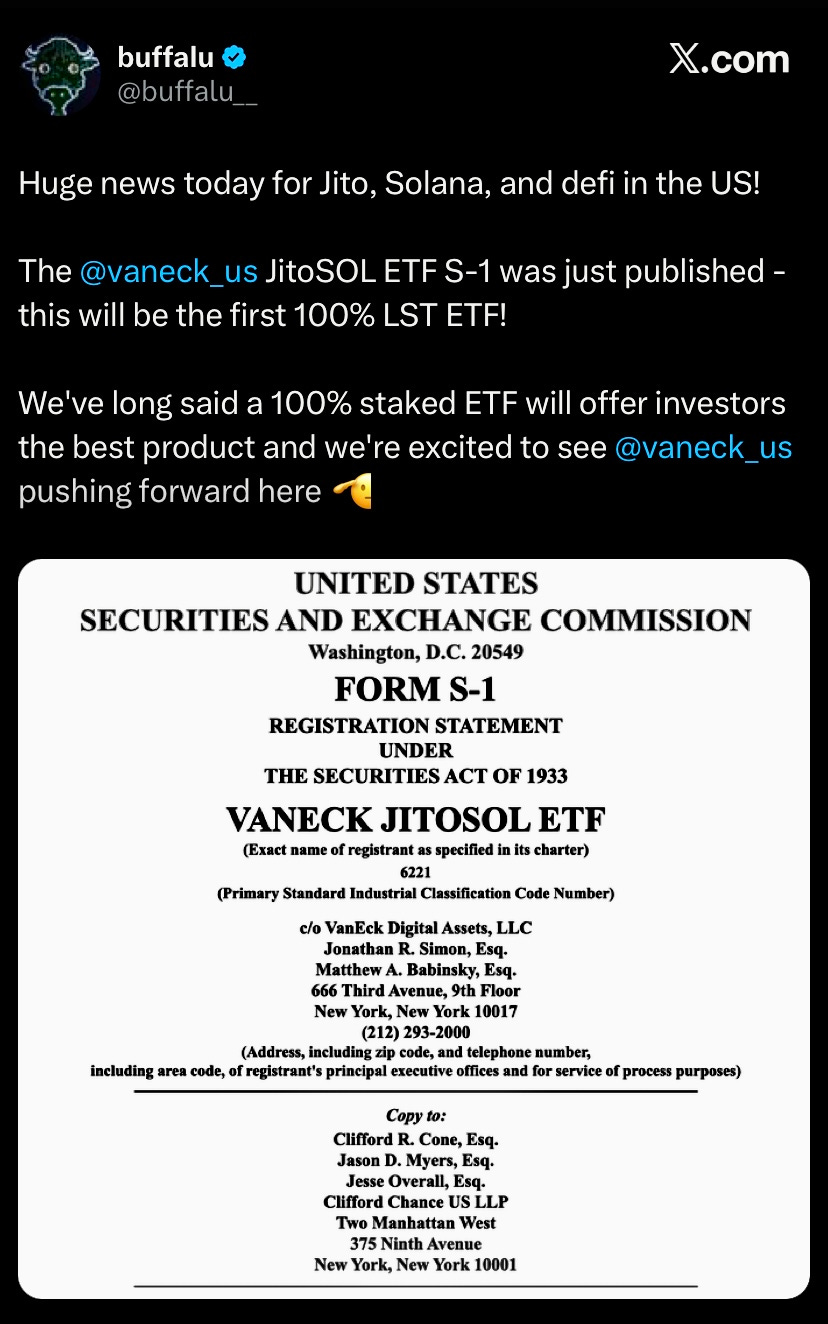 Vaneck filed for JitoSOL ETF, this comes shortly after THE SEC clarified liquid staking tokens aren’t securities