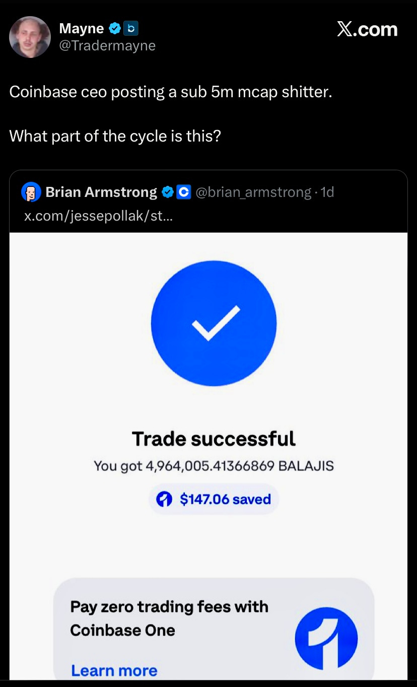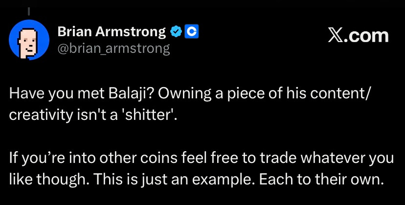 Brian Armstrong shilled a Zora creator coin Balagi on X giving it a 10x