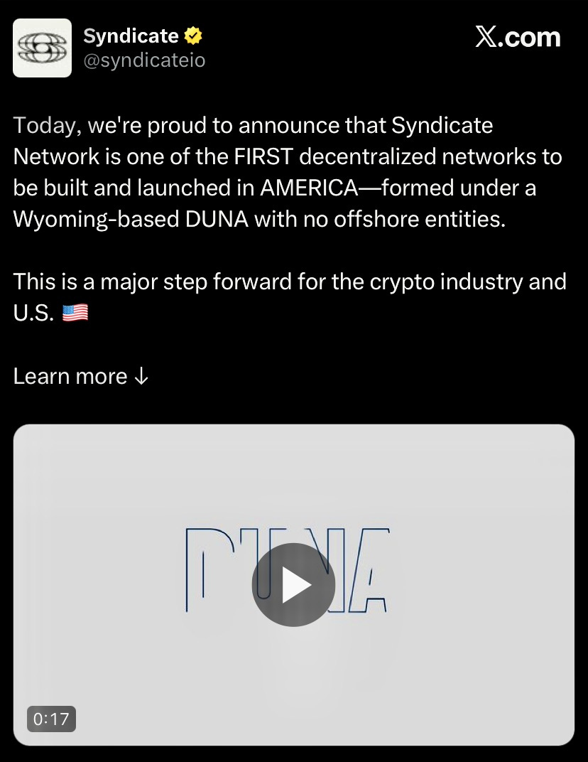 Syndicate launched Wyoming based DUNA. DUNA enables decentralized networks to comply with US law