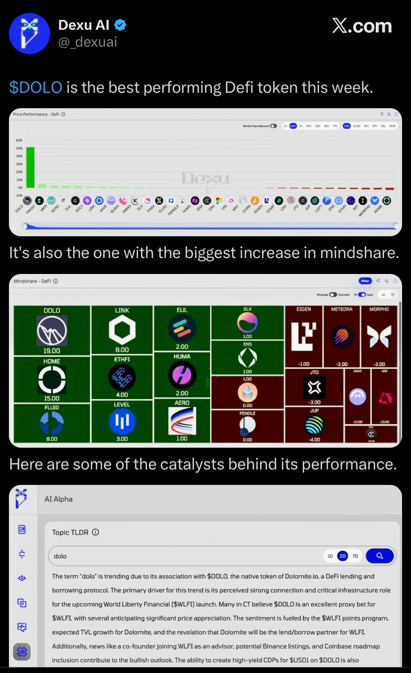 Dolomite Dolo does a 10x from June, seen as a WLFI proxy bet; WLFI lending partner